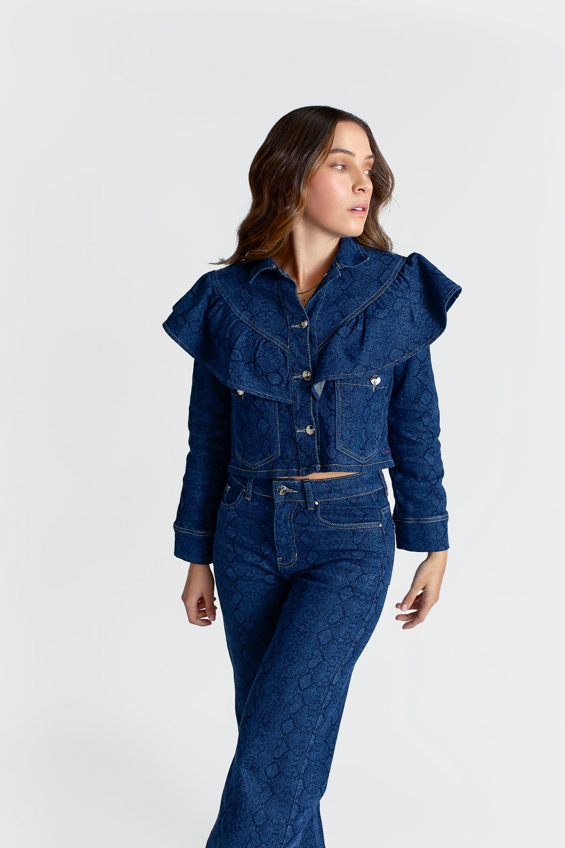La Chaqueta Serena es una oda al detalle y a la feminidad con carácter. Confeccionada en denim con textura inspirada en piel de serpiente, esta prenda se distingue por su cuello amplio con volantes estructurados, que enmarcan el rostro y aportan un toque teatral y elegante.