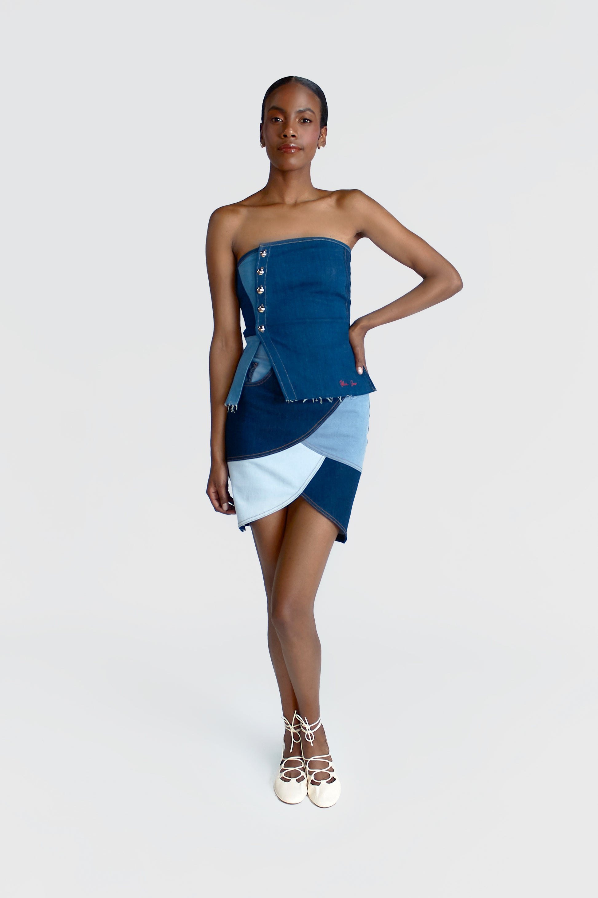 La Falda Luna representa el ciclo, el cambio y la feminidad en constante evolución. Confeccionada a partir de retazos de denim en distintos tonos, transforma los fragmentos en una composición armónica que refleja la dualidad entre fuerza y suavidad.