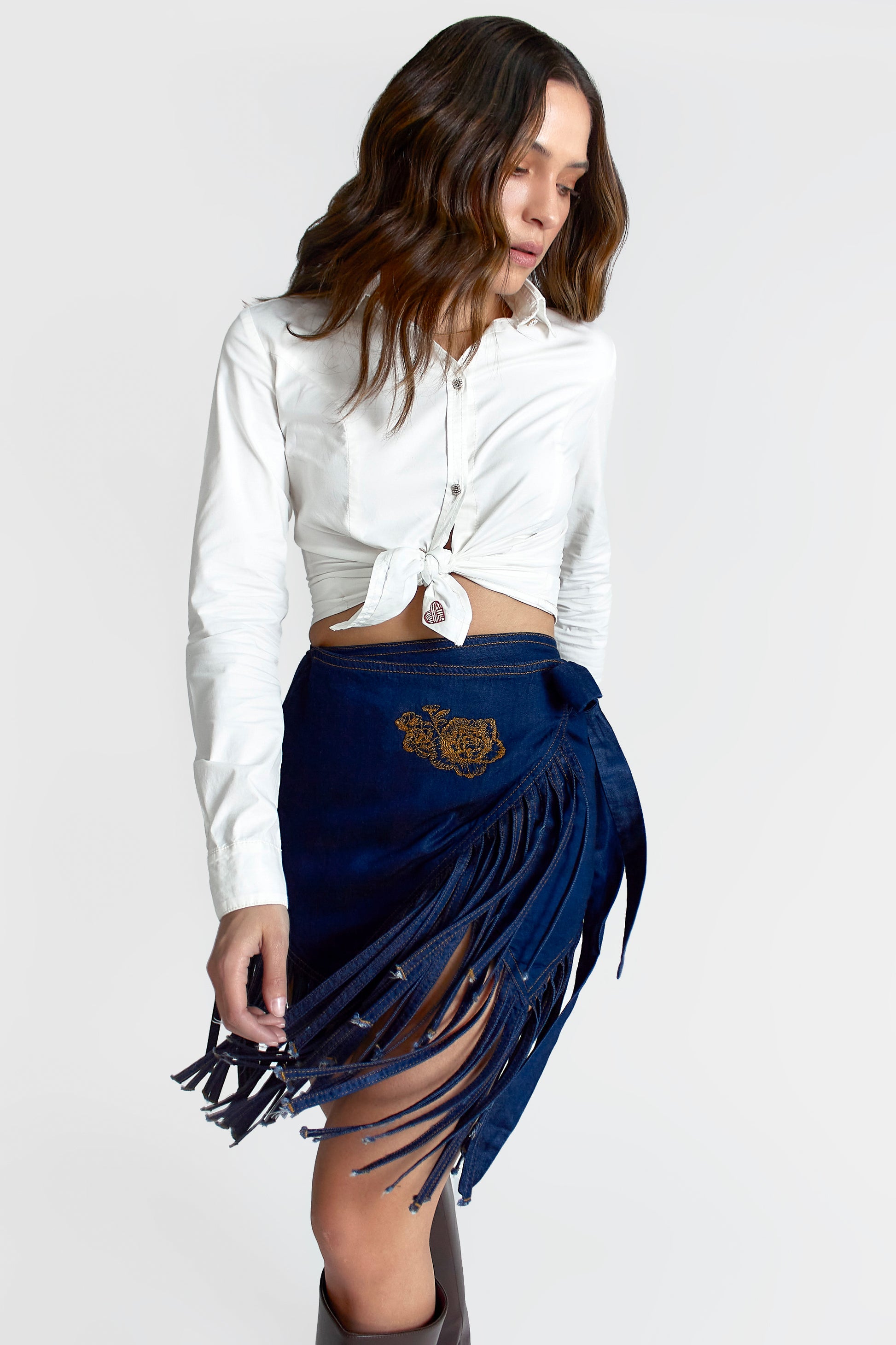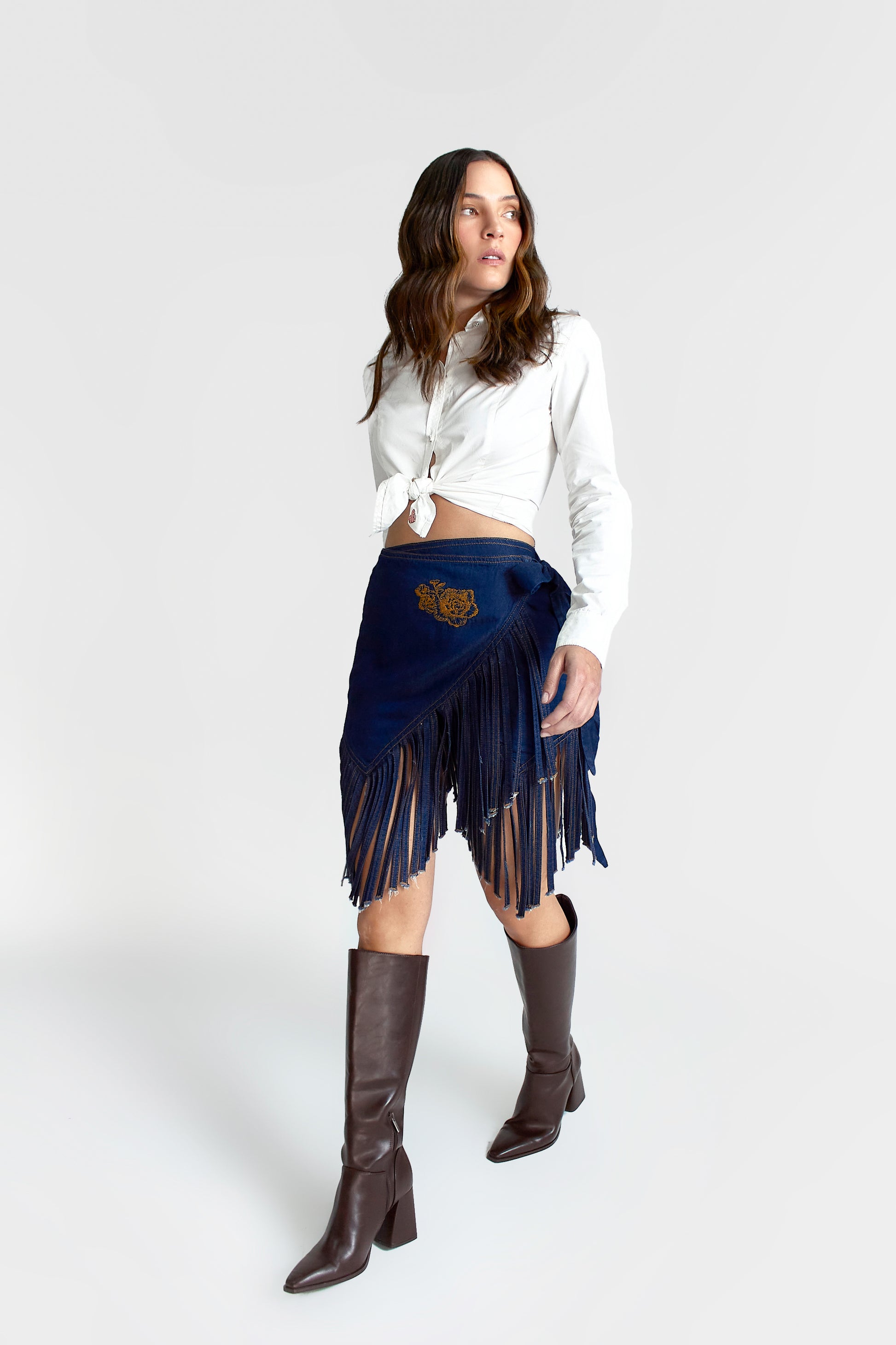 La Falda Siena celebra el movimiento y la libertad. Confeccionada en denim azul profundo, su diseño envolvente se distingue por el flecado artesanal que aporta dinamismo y fluidez a cada paso.